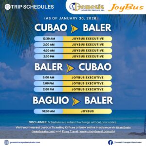 - Baler to Cubao schedule: 6:00 AM, 12:00 PM, 1:00 PM, and 2:00 PM